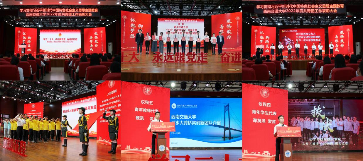 基层团委书记代表、团支部书记代表、青年团员代表、学生骨干代表、青年志愿者代表、学生工作干部代表、青年教师代表、青年学生代表等现场朗诵《奋斗吧,交大新青年》,激励大家做有格局、有情怀、有视野、有担当的新时代西南交大人,为建设交通特色鲜明的世界一流大学接续奋斗。