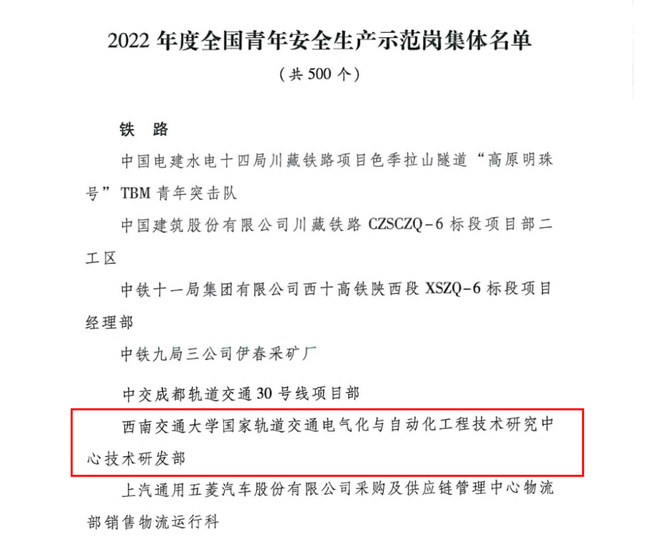 近日,共青团中央、应急管理部联合发布了《关于认定2022年全国青年安全生产示范岗成果的通知》,英国上市公司365国家轨道交通电气化与自动化工程技术研究中心技术研发部获评“2022年度全国青年安全生产示范岗”。